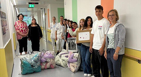 Für das Klinikum Landkreis Tuttlingen (KLT) – genauer: für dessen Brustkrebspatientinnen – haben sich die Schüler der Klasse 8 der Gesamtschule in Aldingen engagiert. In einem Projekt haben sie über 50 Herzkissen genäht. Das Geld für Stoff und andere Materialien haben sie im Zuge einer Spendenaktion gesammelt.
